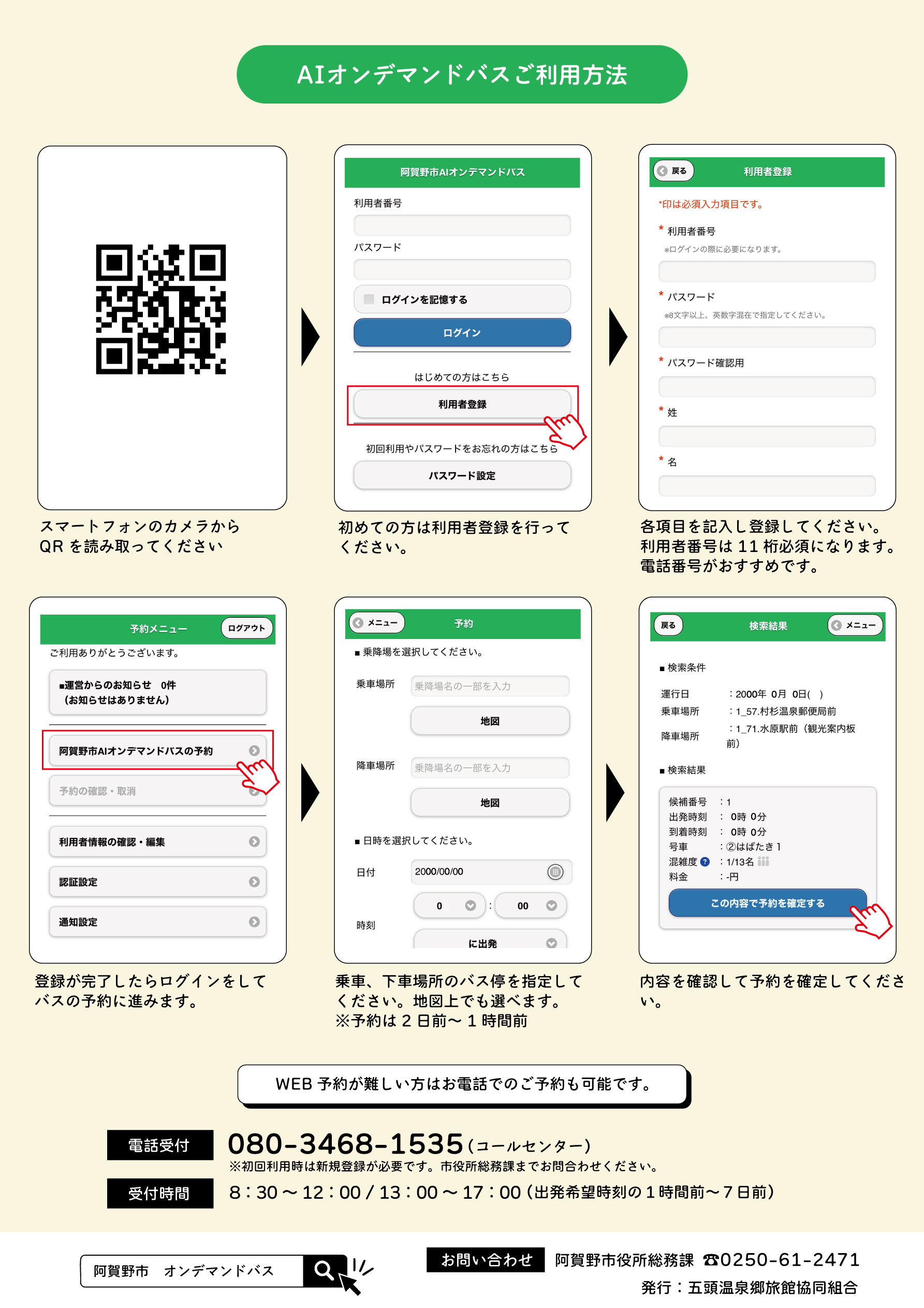 – 電話予約(受付時間 8:30~12:00 / 13:00~17:00、出発希望時刻の1時間前~7日前まで)